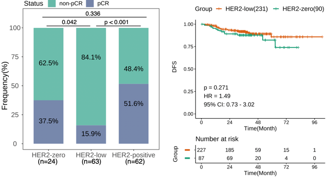 我们进一步分析了总体队列中149名接受新辅助治疗患者的治疗结果。HER2低表达亚组的病理完全缓解(pCR)率明显更低,仅有15.9%,而HER2零表达亚组为37.5%(p=0.042),HER2阳性亚组则高达51.6%(p<0.001)。而在无疾病生存率的比较上,HER2低表达和零表达两个亚组之间则没有显著性的差异(p=0.271),且不受病理完全缓解、HR为状态或基于IHC何种分子分型的影响。
