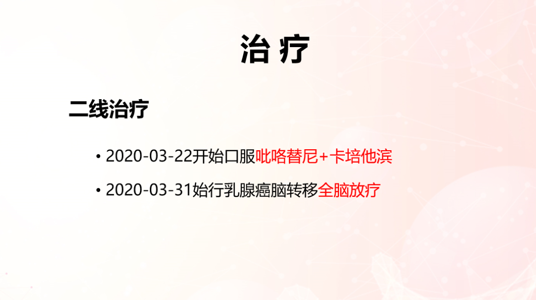 林颖教授:该患者目前有颅内进展,颅外状况需要进一步了解。如果该患者原本的肝转移控制的非常好,此时我们可有两种选择。首先,根据指南来说,脑转移主要是局部治疗,如果全脑多发转移,则更倾向于保护海马体的全脑放疗,此时,全身治疗方案是否一定要更改为二线,还需要结合颅外的情况。如果颅外非常稳定,我认为不需要更改为二线的全身治疗方案。如果颅外也有进展,基于中国国情会更多的考虑更改为TKI+化疗方案。此外,T-DM1也是一个不错的选择。但在KATHERINE研究中可以看到,T-DM1和曲妥珠单抗对于颅内进展患者的DFS获益没有太大差别。另外,对于晚期单纯脑转移患者,由闫敏教授牵头的著名的PERMEATE研究显示出TKI具有非常好的疗效,而T-DM1的疗效似乎不那么确切。