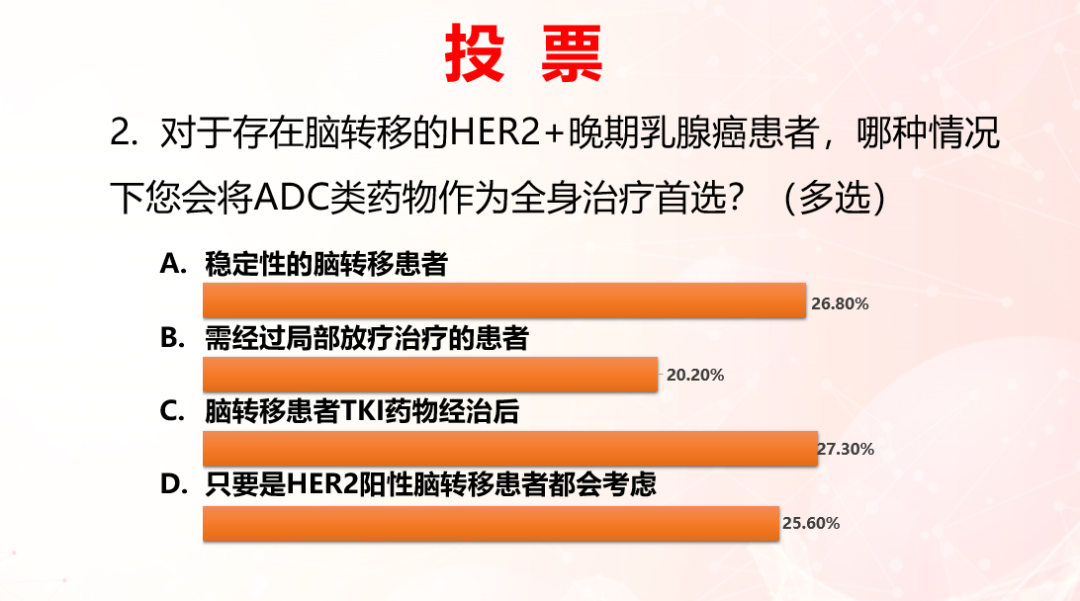 网上医生投票结果揭晓:支持脑转移患者TKI药物经治后将ADC作为首选的网络医生最多,其次为支持稳定性的脑转移患者、只要是HER2+脑转移患者都会考虑、需经过局部放射治疗的患者。