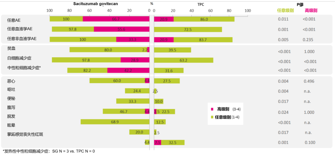 研究结果:共88例接受过新辅助治疗的高复发风险HER2阴性乳腺癌患者,45例(100%)接受戈沙妥珠单抗的患者均出现了1~4级的不良事件(AEs);43名接受医生选择治疗(TPC)(卡培他滨:32名,观察:11名)的患者中有37例(86.0%)出现了1~4级AEs。3~4级AE发生率分别为66.7%和20.9%。戈沙妥珠单抗组更常出现所有级别以及3~4级血液学AE。非血液学AE包括:恶心、呕吐、便秘、腹泻和脱发。无死亡病例。