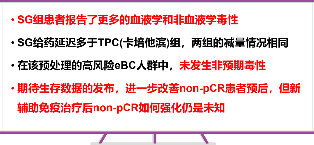5、Safety interim analysis(SIA)of the phase III postneoadjuvant SASCIA study evaluating sacituzumab govitecan(SG)in patients with primary HER2-negative breast cancer(BC)at high relapse risk after neoadjuvant treatment.2022 ESMO BC Abs-58O