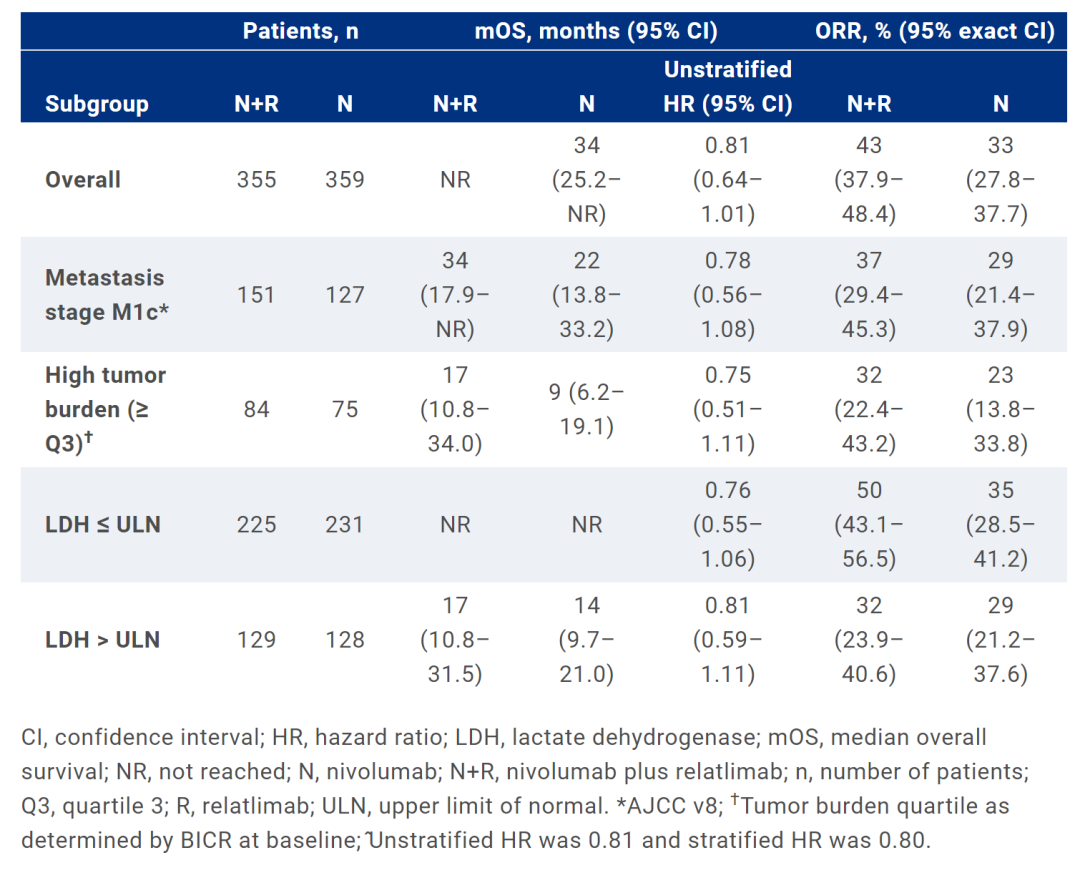 方法:患者1:1 随机接受 RELA 160 mg +480 mg或 NIVO 480 mg静脉输注, 4 周一次。主要终点是独立中心影像(BICR)根据 RECIST v1.1 评价的无进展生存期(PFS)。次要终点是OS和(BICR)评价的ORR,并进行分级检测。探索性分析包括按预先设定的亚组进行PFS、OS和ORR的分析。