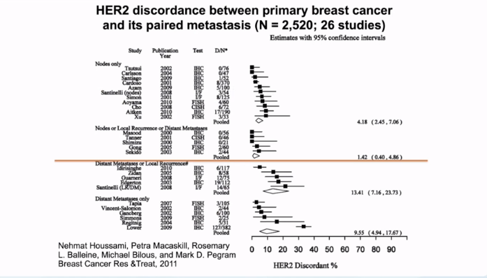 Mark D.Pegram教授在讲课中谈到,癌症是一个动态发展的过程,基因的克隆扩增受到很多因素的影响,包括基因突变、癌症基因中断等,与肿瘤进化的“大爆炸”假说相一致。既往相关研究结果显示,即使在同一肿瘤患者身上,不同部位肿瘤间也存在着较大的差异。随后,Mark D.Pegram教授对相关研究进行了介绍。2012年《新英格兰医学》杂志上一篇关于肾癌的文章中提到肿瘤不同位置、转移灶和原发灶之间存在DNA测序的差异。2017年发表在《Nat Genet》的一项研究展示了不同肿瘤内异质性的模式,可以通过多区域测序来区分,这与耐药有很大的相关性。悉尼的Houssami教授发表了关于HER2+乳腺癌患者的研究结果,该研究比较了患者不同病灶的免疫组化和FISH结果,发现在原发灶、淋巴结转移灶和远处转移灶之间,HER2的表达有很大差异。