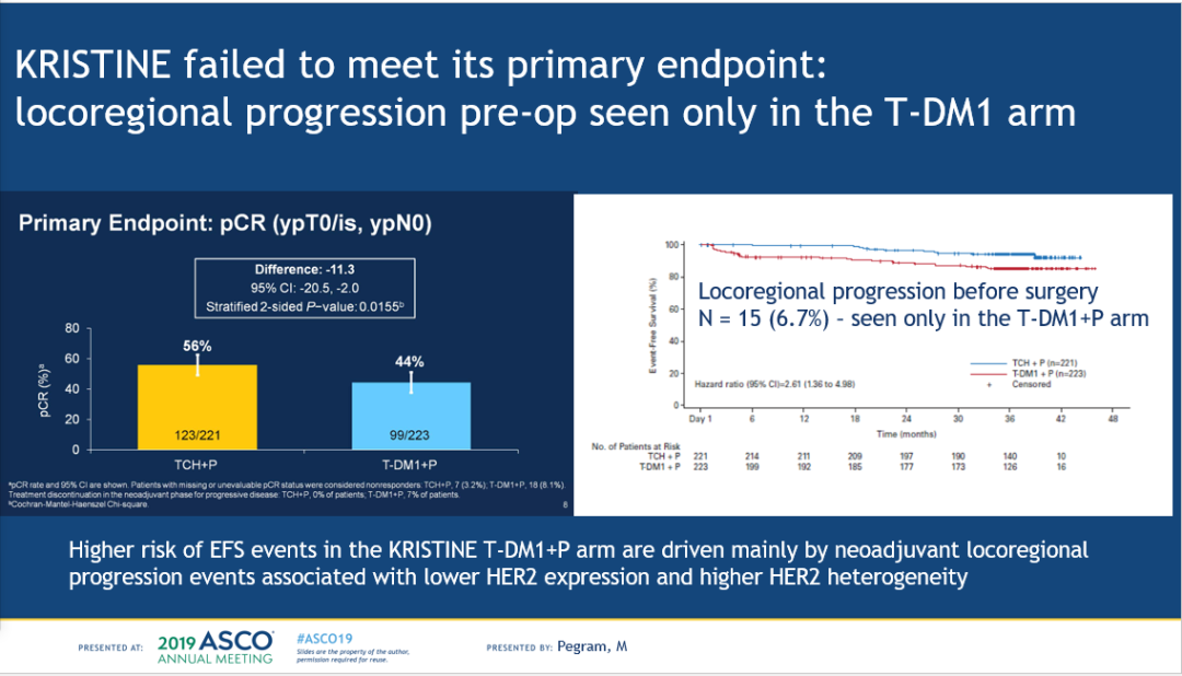 MARIANNE研究也针对HER2异质性进行了分类,分类标准同KRISTINE研究,亚组分析显示,在局部表达组和异质性表达组中,T-DM1组和T-DM1+P组的PFS均较TH组低,而在同源性表达组,三组治疗方案均能得到较好的PFS。Prof.Mark.pegram提到的Dana-Farber癌症中心的II期临床研究其结果也同样显示,瘤内HER2异质性强的肿瘤,T-DM1+帕妥珠单抗方案pCR更低。