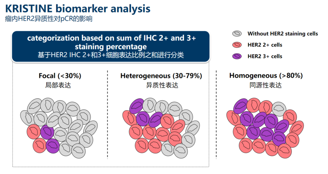 薛妍教授在讲课中提到,多项研究对HER2异质性进行了评估,提示瘤内HER2异质性与临床预后相关。KRISTINE研究分析了HER2异质性对pCR的影响,研究者通过IHC对HER2异质性进行分类,包括局部表达(HER2 2+及3+<30%);异质性表达(30%<HER2 2+及3+<79%);同源性表达(HER2 2+及3+>80%)。结果显示,同源性表达的患者pCR率最高,瘤内异质性更强的肿瘤pCR率更低,且以瘤内HER2异质性分类较免疫组化结果分类更能有效预测pCR。