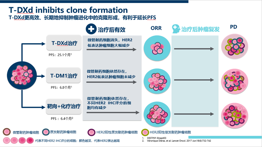Mark D.Pegram教授在讲课中还提到,T-DXd作为新一代的ADC,重新结构优化了有效载荷以及连接子,被内吞进入肿瘤细胞时释放有效载荷抑制拓扑异构酶Ⅰ并导致细胞死亡,这种高效和低毒的特性,使它不同于其他靶向HER2 ADC药物;T-DXd采用了可裂解的连接子,同时释放的载药DXd具备良好的细胞膜渗透性,使得T-DXd不仅能杀伤HER2阳性肿瘤细胞还能透过细胞膜攻击邻近的HER2阴性的肿瘤细胞,因此对异质性的肿瘤团块起到一定的杀伤作用。T-DXd在一定程度上克服瘤内HER2的异质性也能解释DESTINY-Breast 03研究中在HER2阳性患者突破性的获益:PFS超过2年,ORR接近80%。对于HER2低表达的患者,DESTINY-Breast04研究也取得了较好的生存结果。