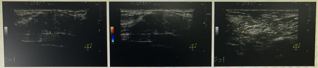左侧腺体外上象限见一低回声团块,大约5.1cm×1.7cm×4.4cm,界欠清,形态不规则,边缘见毛刺及蟹足状改变,周边见高回声晕,内见强回声点,局部可见较丰富血流信号。左侧腋窝见数个淋巴结,大者约2.0cm×1.8cm,界清,可见淋巴门部结构,实质弥漫性增厚,可见较丰富血流信号。左侧锁骨下见数个淋巴结,大者约0.8cm×0.5cm,界清,未见淋巴门部结构,可见少量血流信号。