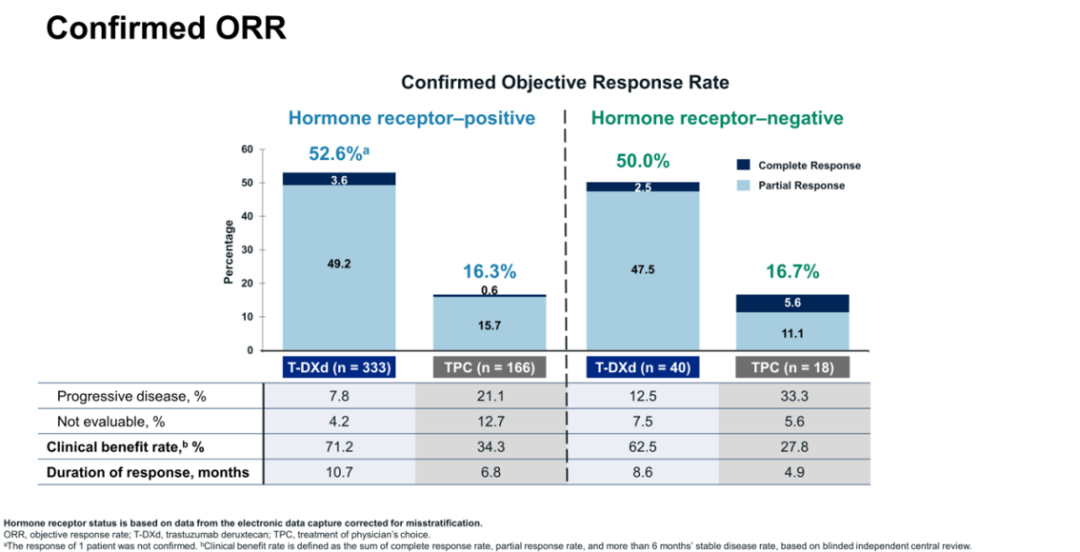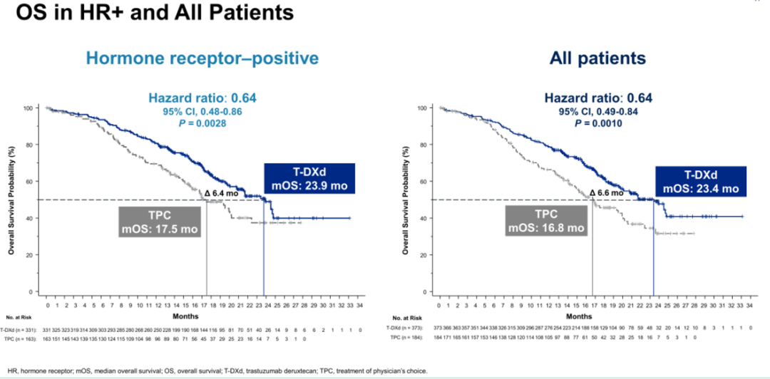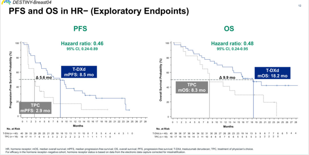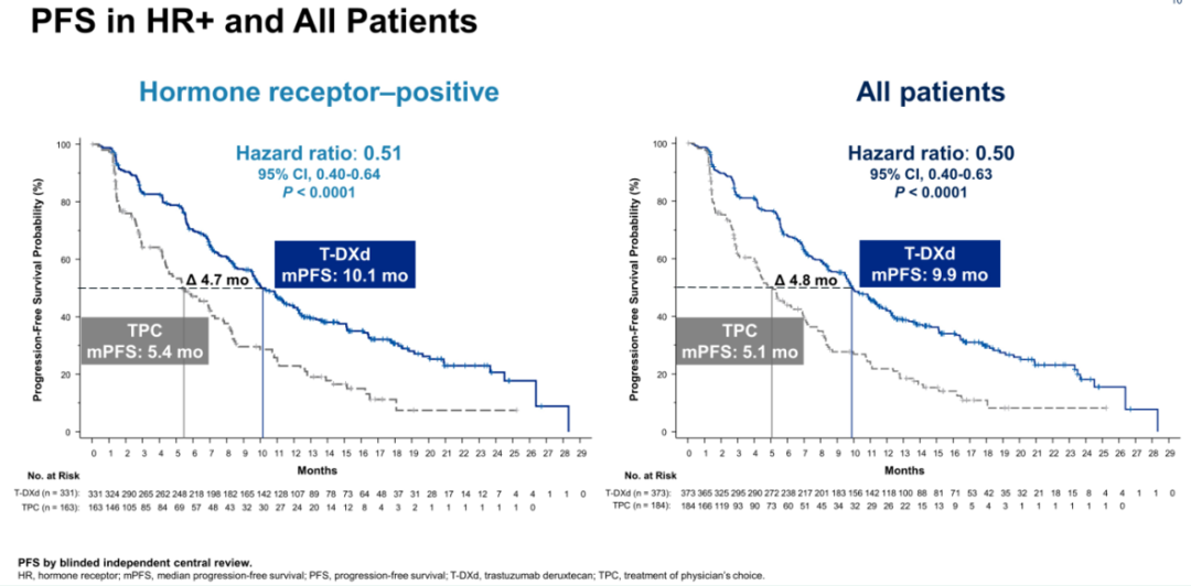 主要研究终点:HR+乳腺癌mPFS,T-DXd显著优于对照组,10.1 vs 5.4个月。