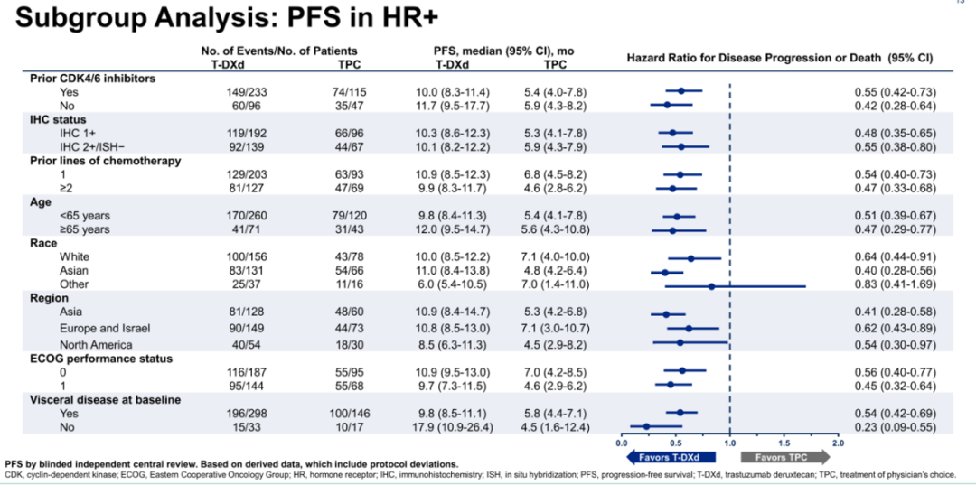 HR+各个亚组均可从T-DXd治疗中获益,包括既往是否接受过CDK4/6i、接受1线还是2线及以上化疗、有无内脏转移。同时,该项研究结果也显示IHC 1+人群(HR 0.48)、IHC 2+人群(HR 0.55)获益相近。基于我们对HER2表达连续性的认知,与既往HER2表达越高、获益越多的认知不符。究其原因,可能与T-DXd强效的payload,强大的旁观者效应和高药物抗体比(DAR)相关。当然亚组分析的本质是探索性的,只能提供提示性的结论,我们还需要谨慎解读。