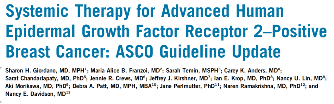 [1]Giordano SH, Franzoi MAB, Temin S, et al. Systemic Therapy for Advanced Human Epidermal Growth Factor Receptor 2-Positive Breast Cancer: ASCO Guideline Update [published online ahead of print, 2022 May 31]. J Clin Oncol. 2022;JCO2200519.