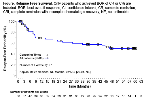 35例ND Ph+ALL患者中,12例入组时为CR(包括2例CMR)。23例可评估患者中22例(96%)达到CR/CRi。1例患者因招募前的化疗导致颅内出血于第18天死亡。1个周期后21/33例患者(64%)达到CMR,任何时间总共28/33例患者(85%)达到CMR。11/15例检测MRD的患者(73%)MRD阴性,MRD检测采用NGS分析,敏感度1×10-6