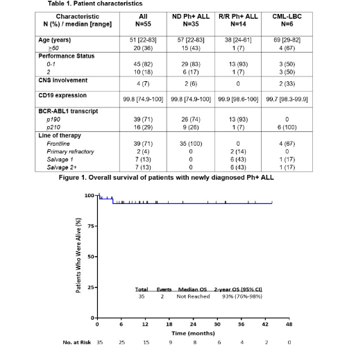 在2年时间内,入组了55例患者,其中35例为新诊断(ND)费城染色体阳性(Ph+)ALL、14例为复发或难治(R/R)Ph+ALL及6例慢粒急淋变(CML-LBP)患者,结果显示:1)对于新诊断的Ph+  ALL患者而言,在可评估疗效的患者中有96%达到完全缓解或血象未完全恢复的完全缓解(CR/CRi),1个治疗周期的完全分子缓解(CMR)为64%;而任何时间的CMR更是高达85%。2)对于复发/难治Ph+ ALL患者而言,14例患者中共有13例可进行分析,其中12例(92%)达到了CR/CRi,1治疗周期后的CMR为71%,任何时间的CMR同样高达79% 。3)6例慢粒急变(CML-LBP)患者中5例达到CR/CRi,CMR为40%。4)在生存方面, ND Ph+ALL患者中,2年EFS和OS率均为93%;R/R Ph+ALL患者中,2年EFS率42%,2年OS率61%;CML-LBP患者中,2年EFS率33%,2年OS率60%。