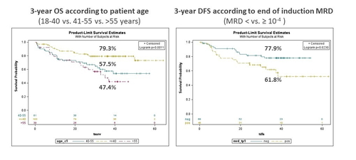 含培门冬酶的ALL方案可安全的用于研究中的多数18-65岁患者,3年OS、EFS和DFS率>50%。55岁以下患者的结果更好,尤其是18-40岁患者以及那些达到最大MRD缓解的患者(无论年龄)(图)。后续将根据患者年龄、体重指数、肝脏脂肪变以及初次或既往药物暴露所致的选择性毒性确定培门冬酶剂量,以最大程度减少毒性,并将其纳入GIMEMA研究中的序贯化疗-贝林妥欧单抗方案中(EHA Congress 2021,摘要S114),用于治疗CD19+成年B-ALL。