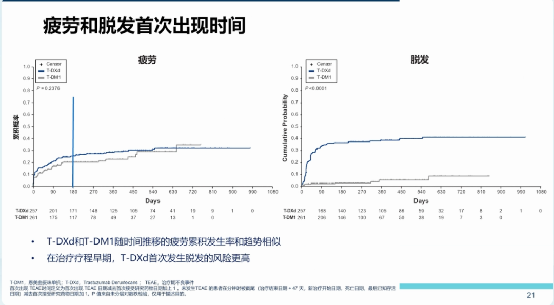 从TEAE发生的数量上看,TEAE(任何等级和≥3级)和严重TEAE(任何等级和≥3级)在T-DXd组和T-DM1组的发生率相似,但是TEAE相关停药和TEAE相关药物减量在T-DXd组的发生率远大于T-DM1组。对数据进行分析发现,在该项研究中T-DXd的中位治疗的持续时间是16.1个月,远大于对照组的6.9个月,随着治疗时间的延长,TEAE数量也就更多。