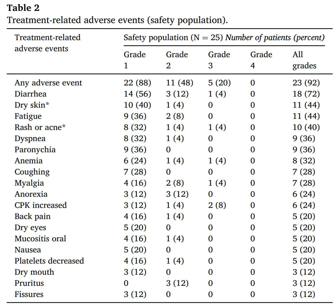 安全性:所有患者均出现任何级别全因不良反应,其中治疗相关不良反应发生率92%,最常见的为腹泻72%、皮肤干燥44%、疲乏44%、皮疹40%;20%的患者出现3度及以上治疗相关不良反应,SAE发生率为36%,其中12%的SAE考虑与治疗相关,32%的患者因不良反应需要进行剂量调整或降低,未出现其他的与安全性有关的信号。