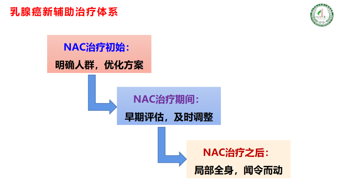 乳腺癌新辅助治疗全程治疗体系包含三个部分:①明确人群,优化方案;②早期评估,及时调整;③局部全身,闻令而动。