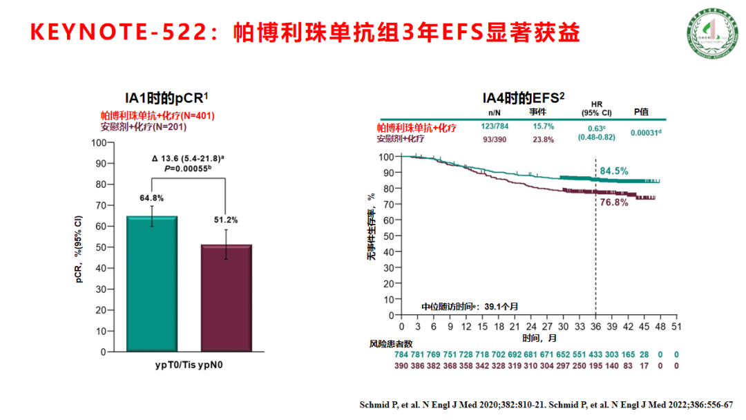 免疫治疗是TNBC新辅助的新热点,通过KEYNOTE-522研究可以看到,在传统的化疗基础上加上免疫治疗,pCR率提高了13.6%,同时在今年公布数据中我们可以看到,EFS也是有显著获益的,在中位随访3年后,使用免疫治疗组EFS绝对获益提高了7.7%,这一结果也即将改变临床实践。