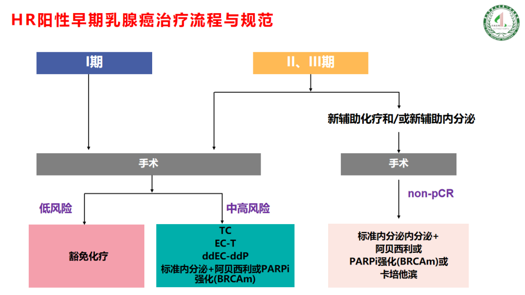 综上所述,HR阳性早期乳腺癌治疗的流程与规范如下:Ⅱ期、Ⅲ期部分患者需要进行新辅助化疗和/或新辅助内分泌治疗,pCR的患者继续之前的策略,non-pCR的患者在标准的内分泌治疗基础上可以加阿贝西利;针对BRCA突变的患者,可以使用PARPi进行强化;如果患者经济条件不允许,可以使用卡培他滨进行强化。同时针对直接手术的患者,术后要区分是低风险还是中高风险,如果经过基因检测依旧是低风险的患者可以豁免化疗;中高风险的患者可以根据淋巴结转移情况选择TC、EC-T、ddEC-ddP、标准内分泌+阿贝西利或PARPi强化(BRCAm)来进行化疗的强化。