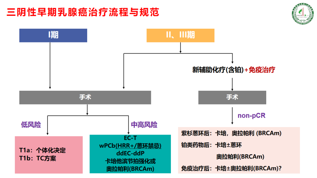 三阴性早期乳腺癌治疗流程与规范:Ⅱ期、Ⅲ期患者大部分需要进行新辅助化疗(含铂)+免疫治疗,针对手术后non-pCR的患者强化治疗非常重要,卡培他滨和奥拉帕在这部分患者中表现出了非常好的数据;针对直接手术的患者,术后依旧要区分低风险和中高风险,针对低风险的患者,T1a的患者进行个体化的决策,T1b的患者使用TC方案;针对中高风险的患者,紫杉蒽环是必须的,同时密集的方案也非常有必要,可以选择EC-T、WPCb(HRR+/蒽环禁忌)、 ddEC-ddP或者卡培他滨节拍强化或奥拉帕利(BRCAm)方案来进行辅助阶段的治疗。