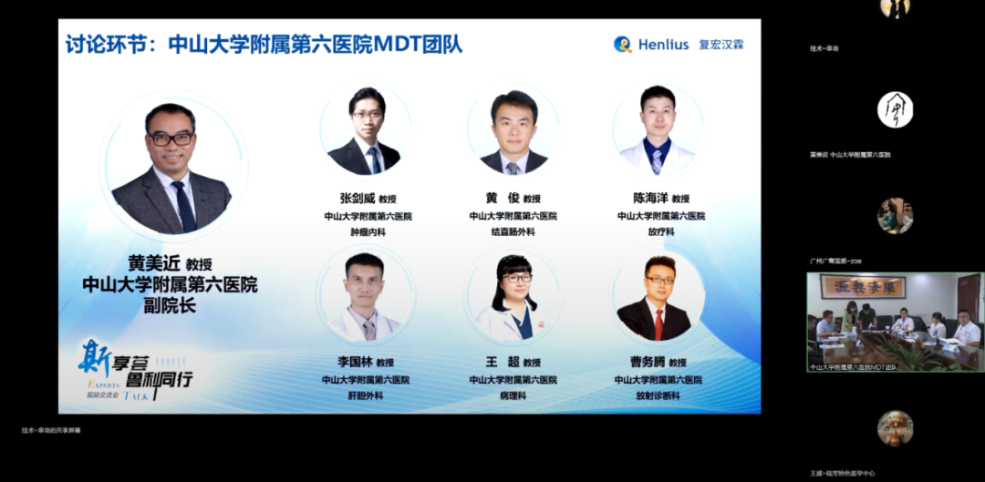 中山大学第六医院MDT团队成员放射诊断科曹务腾教授、放疗科陈海洋教授、结直肠外科黄俊教授、肝胆外科李国林教授、病理科王超教授、肿瘤内科张剑威教授在黄美近教授的带领下,对该病例的整个治疗过程展开分析,内容涵盖了林奇综合征、原发灶及转移灶的时空异质性、不同肿瘤部位是否均需分子检测、免疫治疗与化疗引起的肿瘤退缩的异同、结直肠癌肝转移、粘液腺癌免疫治疗疗效影像评估、放疗对免疫治疗增敏作用、免疫联合用药策略等方面。
