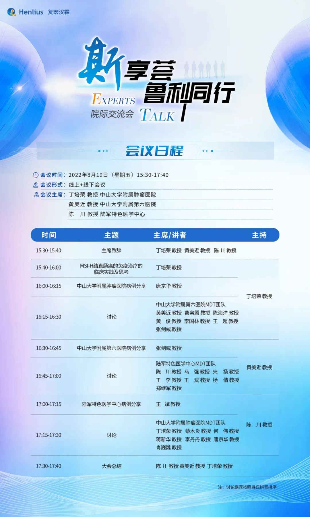 2022年8月19日,斯享荟·鲁利同行院际交流会云端召开。本次会议由中山大学附属肿瘤医院丁培荣教授、中山大学附属第六医院黄美近教授、陆军特色医学中心陈川教授担任大会主席,在丁培荣教授讲解了《MSI-H结直肠癌免疫治疗的临床实践及思考》后,中山大学附属肿瘤医院唐京华教授、中山大学附属第六医院张剑威教授、陆军特色医学中心王斌教授依次分享了典型病例,并由三家医院MDT团队分别对病例展开详细分析,为共同探寻结直肠癌免疫治疗新动向提供重要意义。