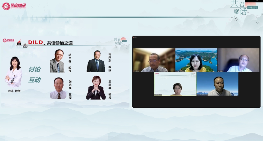 为应对肿瘤患者临床治疗中常见的DILD,2022年8月16日19:00~20:30,在复旦大学附属肿瘤医院胡夕春教授的组织下,辽宁省肿瘤医院孙涛教授、上海交通大学医学院附属仁济医院蒋捍东教授、北京医院张永强教授、复旦大学附属肿瘤医院王磊苹教授共同就DILD治疗相关问题进行了授课和讨论,共同为我们带来了一场视听盛宴。