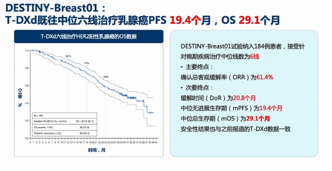 T-DXd的出现,为HER2阳性晚期乳腺癌患者的治疗带来了更多希望。随后,徐菲教授对T-DXd的相关研究进行了回顾。DB-01研究显示,在既往中位治疗六线的乳腺患者中,患者的PFS可达到19.4个月,OS也达到了29.1个月。