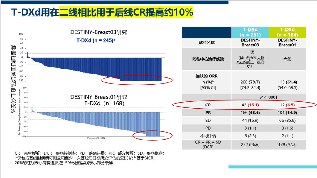 徐菲教授在讲课中提到,在既往治疗线数为六线患者中T-DXd显示出了良好的治疗效果,但如果能将其更早期应用,患者治疗的有效性会更高。DB03研究显示,T-DXd用于二线治疗ORR可达到79.7%;用在二线治疗的CR率相比于后线提高了约10%,可达到16.1%,且患者总的PFS延长更为明显。因此,好药先用,应更早期用T-DXd,可以让患者有更多的治疗机会。