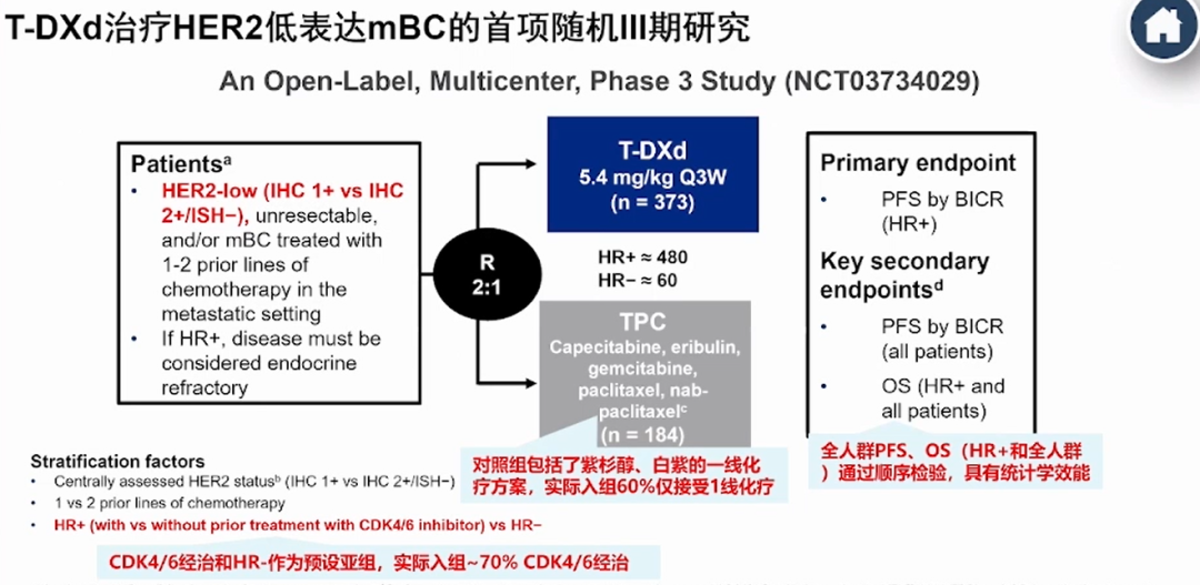 基于DB-04研究结果,NCCN、ASCO等国际指南迅速做出更新,将T-DXd用于HER2低表达(IHC 1+或2+且FISH-)且至少接受过一次化疗的转移性乳腺癌患者(HR+患者为内分泌耐药)。FDA也快速批准了T-DXd新的适应症,用于治疗HER2低表达(IHC 1+或IHC 2+/ISH-)不可手术切除或转移的成人乳腺癌患者,转移的患者既往接受过化疗或患者完成辅助化疗6个月内或期间复发。
