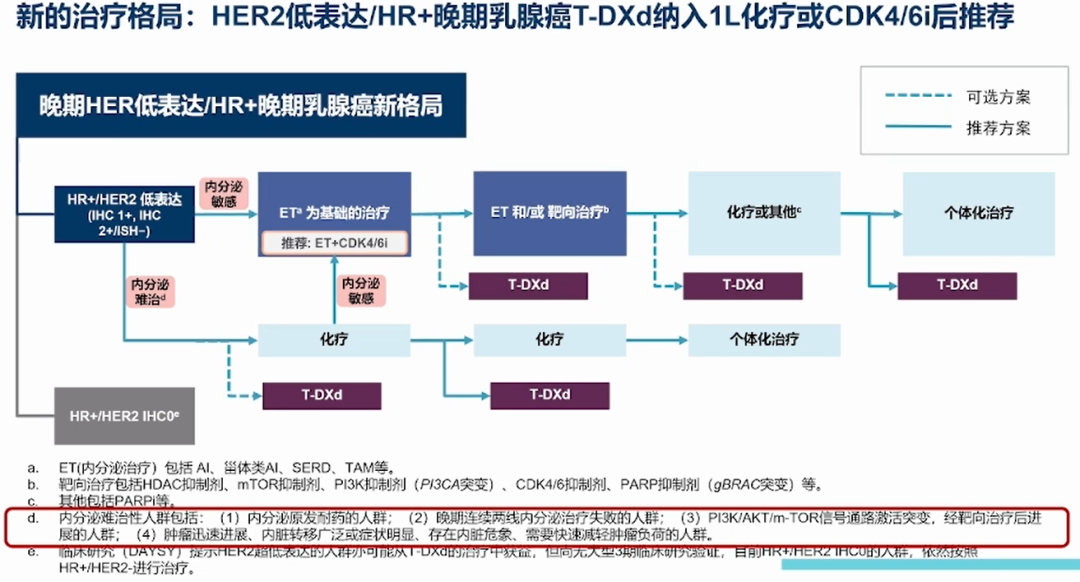 ADC药物的崛起改变了HR阳性乳腺癌晚期治疗的格局。HR+/HER2低表达的患者治疗前需要预先区分内分泌敏感和难治的病人,对于内分泌治敏感的患者仍然推荐以CDK4/6抑制剂为联合治疗的方案;对于内分泌难治的病人,可以进行化疗,目前也可将T-DXd作为一个首选推荐方案。