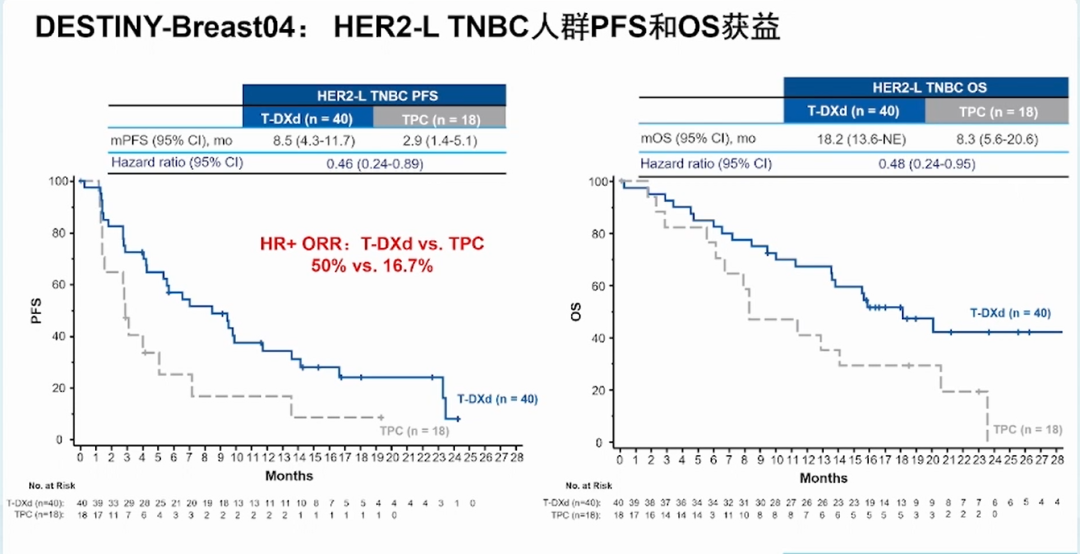 TROPiCS-02研究在ASCO大会上公布的结果显示,SG对于经多线治疗的HR+/HER2-晚期乳腺癌患者显示了PFS获益,mPFS为5.5个月,OS无获益。DB-04研究结果显示,无论在HR+患者人群还是全人群中,T-DXd用于HER2低表达患者均获得PFS(10.1个月)和OS(23.9个月)的获益。此外,DB-04研究中HR+患者接近90%,因此,DB-04研究实际上更多的反映了HR+患者的治疗现状。