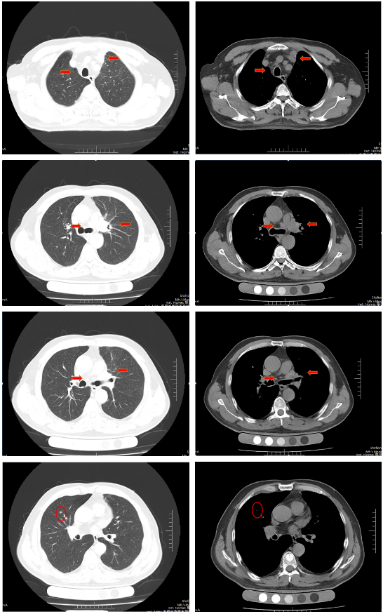 治疗后评价:患者经过EP方案联合斯鲁利单抗治疗四周期后,患者咳嗽、咳痰及左侧胸痛症状消失,体重逐渐恢复;影像学提示左肺病灶及纵膈淋巴结及肺门淋巴结较前明显缩小(缩小>30%),右肺结节基本消失;疗效评价:PR(接近CR)。