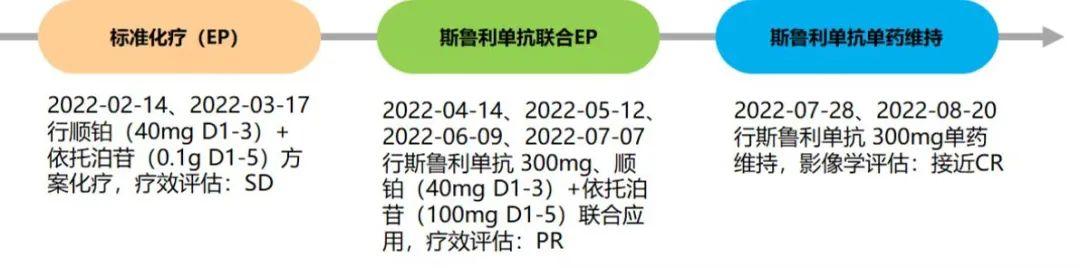 2022-04-14、2022-05-12、2022-06-09、2022-07-07应用斯鲁利单抗 300mg+顺铂(40mg d1-3)+依托泊苷(100mg d1-5)治疗4周期。