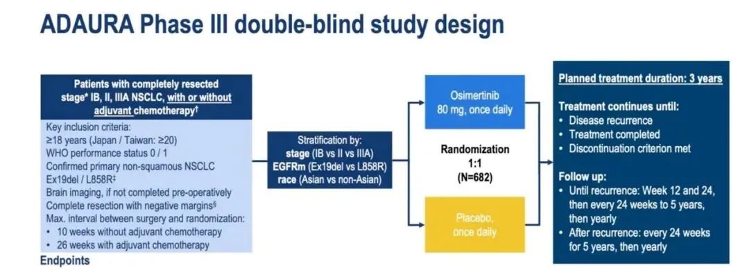 ADAURA研究纳入年龄18岁、WHO PS 0/1、完全切除的EGFR突变阳性IB-IIIA期(AJCC第7版)NSCLC患者,允许接受辅助化疗。患者按1:1随机分配至奥希替尼(80 mg每日一次)组或安慰剂组,最长3年。主要终点是研究者评估的II-IIIA期NSCLC患者的DFS。次要终点为IB-IIIA期患者的DFS、总生存(OS)和安全性。2022 ESMO更新了ADAURA试验最终DFS数据更新、对复发模式的探索性分析以及经过2年的额外随访后的安全性数据。