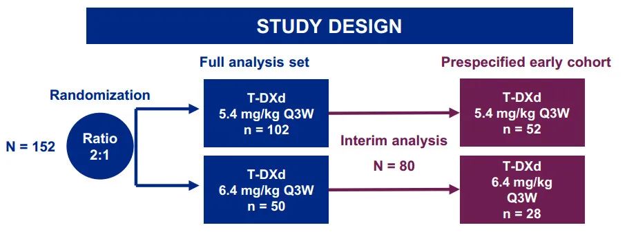 截止2022年3月24日,对预先设定早期队列(Prespecified early cohort)中分配接受5.4mg/kg T-DXd的52例患者和接受6.4mg/kg的T-DXd的28例患者进行了评估。在安全性分析集中,101例患者被分配接受5.4mg/kg方案,50例患者被分配接受6.4mg/kg方案。