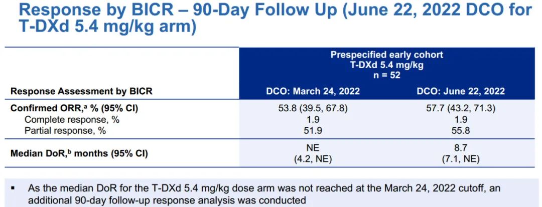 对截止2022年6月22日的数据的另一项分析显示,5.4 mg/kg组的中位DOR为8.7个月(95%CI: 7.1-NE),cORR为57.7%(95%CI: 43.2%-71.3%)。