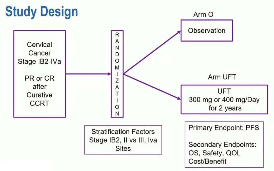 本研究入组标准为FIGO(2009)Ib2-IVa期鳞状细胞癌、腺癌或腺鳞癌的宫颈癌患者,已完成CCRT治疗,且达到完全缓解(CR)或部分缓解(PR),年龄25-75岁,ECOG PS 0-2,具有充分的器官功能;排除CCRT后行子宫切除术、接受过子宫颈癌剖腹探查术、存在残端肿瘤、CCRT前行新辅助化疗、伴随活动性感染和无法控制的并发症、活动期多发肿瘤、腹泻、精神障碍以及对UFT成分有过敏史的患者。入组患者随机(1:1)入组分配至仅观察组(O组)或UFT维持治疗组(UFT组)。体表面积(BSA)≥1.25m2的患者口服UFT剂量为400mg/天,BSA<1.25m2的患者为300mg/天。患者接受UFT治疗两年,直至疾病进展或发生不可耐受的毒性反应。主要研究终点为无进展生存(PFS),次要研究终点包括总生存(OS)、安全性和生活质量。单侧显著水平为0.05。