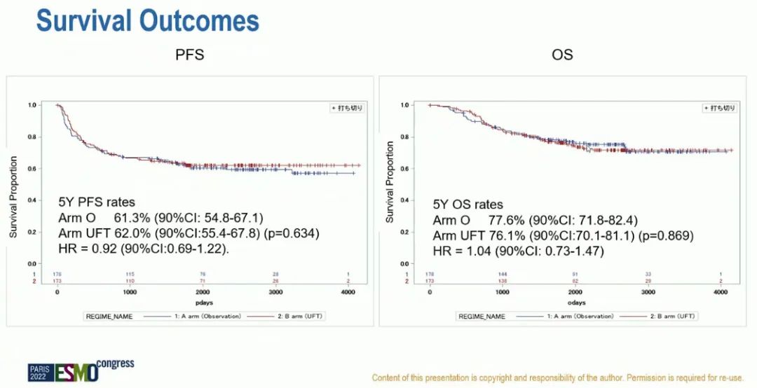 患者的中位PFS未达到。观察组的5年PFS率为61.3%(90%CI:54.8-67.1),UFT组为62.0%(90%CI:55.4-67.8)(HR=0.92,90%CI:0.69-1.22;p=0.634)。观察组的5年OS率为77.6%(90%CI:71.8-82.4),UFT组为76.1%(90%CI:70.1-81.1)(HR=1.04,90%CI:0.73-1.47;p=0.869)。PFS和OS亚组分析显示,大多数亚组的患者没能从UFT维持治疗中获益。