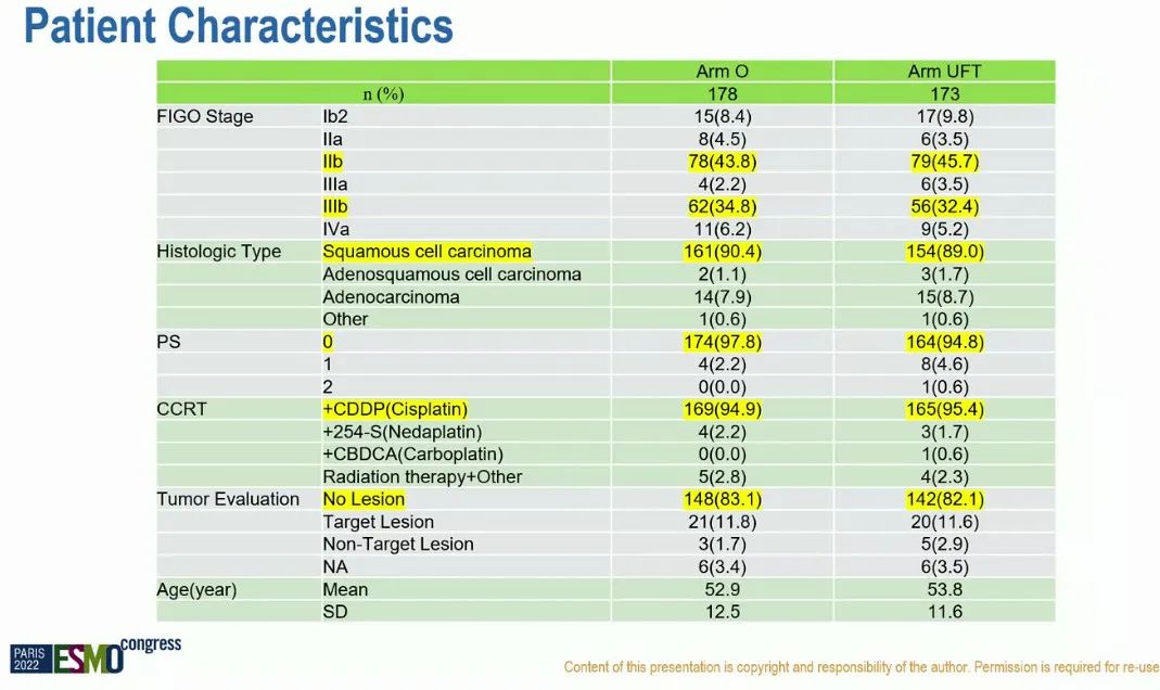 研究入组于2010年开始,并于2018年完成。来自日本55个中心的351例患者被随机分为观察组(178例)和UFT组(173例)。对176例观察组和168例UFT组患者的安全性数据进行了分析。两组患者的基线特征相似,大多数患者为IIb(两组分别为43.8%vs 45.7%)或IIIb期(34.8%vs 32.4%),鳞状细胞癌是最常见的组织学类型(90.4%vs 89.0%),ECOG PS评分为0的患者占比最大(97.8%vs 94.8%),放化疗方案联合顺铂(CDDP)的患者最多(94.9%vs 95.4%),大多数患者没有病灶(83.1%vs 82.1%)。