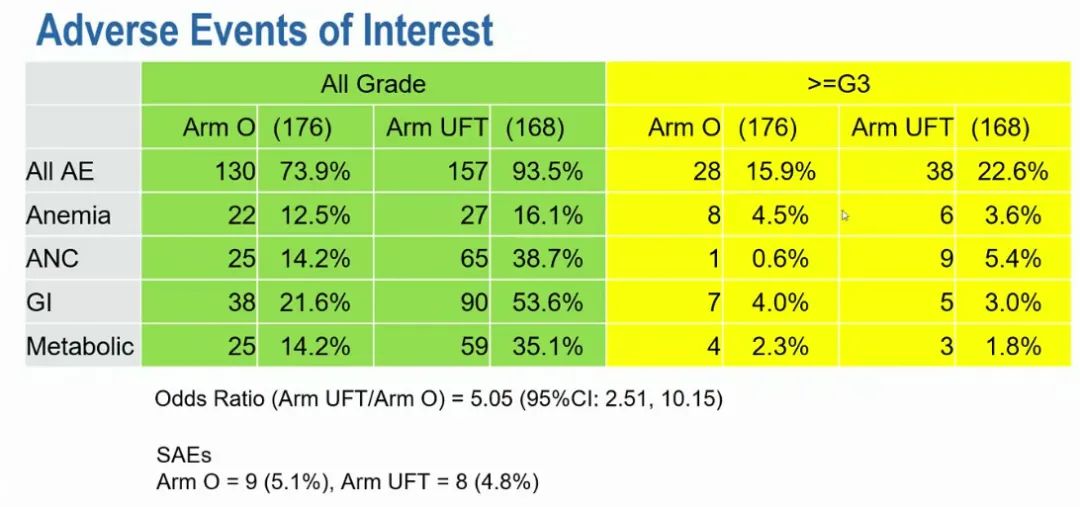 UFT组的不良事件(AE)明显多于观察组,全级别不良事件发生率分别为93.5%vs 73.9%(比值比[OR]为5.05,95%CI:2.51-10.15),大多数AE为1或2级。≥3级AE在观察组的发生率为15.9%,在UFT组为22.6%。