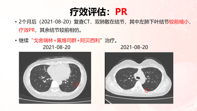 姚静教授:这种情况下,我首先会跟患者沟通,尽可能再次取活检,因为对晚期患者,再次确定病理分型对后续诊疗是非常关键的。该患者的肺部CT与以往相比,有多发的新增结节且高度怀疑肺转移。尽管取样条件不允许或者患者再次拒绝进行肺穿刺活检,结合肺部CT情况,考虑该患者为乳腺癌肺转移,建议患者在OFS的基础上联合氟维司群和CDK4/6抑制剂。