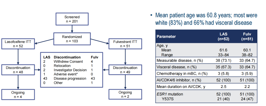 该研究中共有201例患者接受了ESR1突变筛查,103例患者随机分配到拉索昔芬组(52例)或氟维司群组(51例)。随机接受每日口服拉索昔芬5 mg或肌肉注射(IM)Fulv 500 mg(第1、15和29天,然后每4周),直到患者出现疾病进展、死亡、不可耐受的毒性等,主要研究终点:无进展生存(PFS);次要研究终点包括临床获益率(CBR)、客观缓解率(ORR)、不良事件。治疗期间每2个月或者按临床需要进行影像学肿瘤评估。