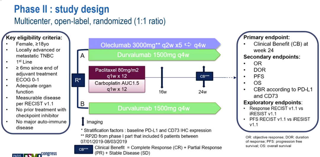 In the SYNERGY trial,we combined this chemo-immunotherapy with an adenosine targeting agent,oleclumab.This is a monoclonal antibody directed against CD73.CD73 is responsible for the generation of immunosuppressive adenosine in the tumor microenvironment.So the combination of a PD-1/PD-L1 immune checkpoint blocker and this adenosine targeting agent is aimed at enhancing the immune response.Patients were randomized to chemotherapy with paclitaxel and carboplatin received over 12 weeks,and oleclumab,the anti-CD73,with durvalumab,an anti-PD-L1.And in the other arm,patients received the same chemotherapy,but with durvalumab alone.After the 12 weeks of immunotherapy,patients continued with immunotherapy maintenance.The primary endpoint was the clinical benefit at week 24.The trial didn’t show a difference in clinical benefit between the two arms,showing 43%CBR in Arm A with the double immunotherapy,and 44%in Arm B with durvalumab alone.