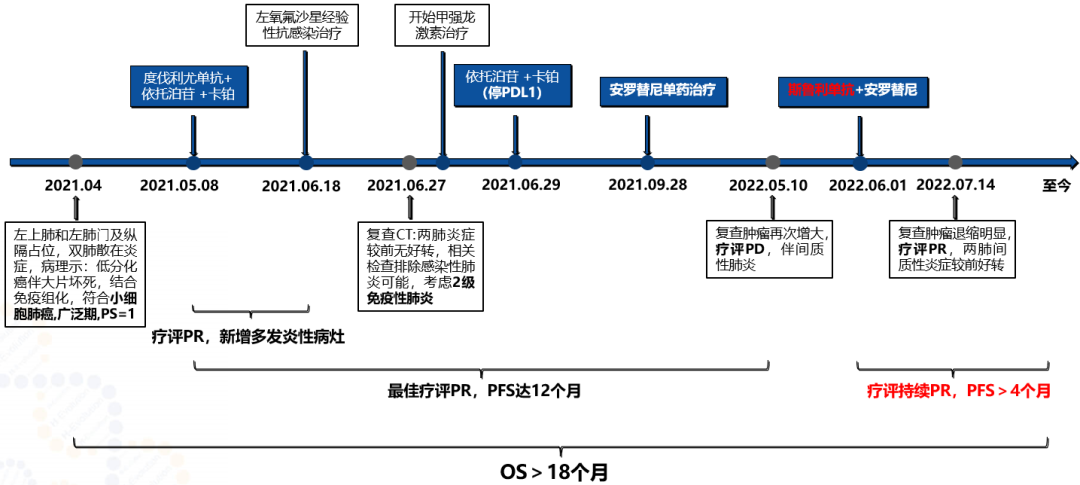 摘要:肺癌是肿瘤相关死亡率最高的恶性肿瘤[1]。小细胞肺癌(SCLC)是肺癌中侵袭性最强的一种亚型,此类肿瘤恶性程度高、倍增时间短、易发生远处转移,初次就诊时即有约2/3患者被诊断为广泛期,约占所有肺癌患者的15-20%,与吸烟密切相关。广泛期小细胞肺癌(extensive-stage SCLC,ES-SCLC)患者的有效治疗方案有限,既往几十年间,一线标准治疗方案为含铂药物化疗,有效率高达60-80%,但患者往往短期内出现复发及耐药,中位生存期仅有10个月左右,5年总生存率不足5%[2]。近年来,随着免疫治疗的广泛应用,一线免疫联合化疗在ES-SCLC患者中显示出良好的OS和PFS获益。但复发SCLC患者预后差,选择方案少,免疫治疗在二线及后线治疗SCLC的探索步伐尚未停歇。目前已有研究探索免疫联合抗血管药物(安罗替尼)二线及后线治疗ES-SCLC的有效性,研究结果初步显露了良好的抗肿瘤活性及耐受性[3]。本文分享一例经一线度伐利尤单抗联合化疗治疗后出现2级免疫性肺炎,后线应用斯鲁利单抗联合安罗替尼治疗ES-SCLC患者病例,探讨免疫联合抗血管靶向药物治疗在ES-SCLC中的疗效和安全性。