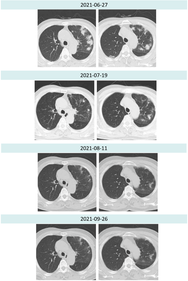 2021年7月19日激素治疗3周后,胸部CT提示:两肺炎症较前明显好转,肿瘤疗效评价持续PR(4.5cm→1.6cm)。