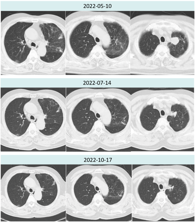 因患者拒绝二线静脉化疗,2021年9月28日开始口服安罗替尼10mg d1-14 q3w治疗,期间复查几次胸部CT,均疗效评价SD。