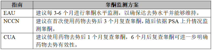 国际国内权威指南均推荐在接受药物去势治疗期间对睾酮水平进行规律监测,但监测频率并不完全一致,详见表2。
