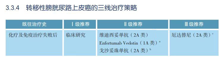 对于“既往免疫治疗失败”的患者,吉西他滨联合铂类化疗仍是主要选择,除此以外,Ⅱ级推荐中增加了Enfortumab Vedtin,主要基于EV201研究队列2的数据,在免疫治疗失败的铂类不能耐受人群中,该方案的ORR为51%,中位DOR为13.8个月,中位PFS和OS分别为6.7个月和16.1个月,美国FDA已经批准其相关适应症,但和FGFR抑制剂厄达替尼一样在国内尚不可及。