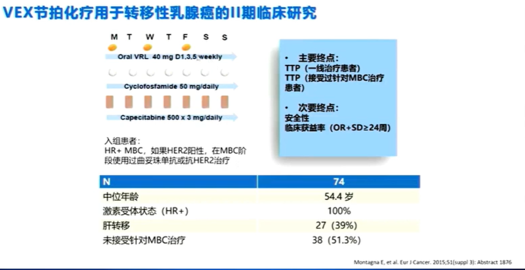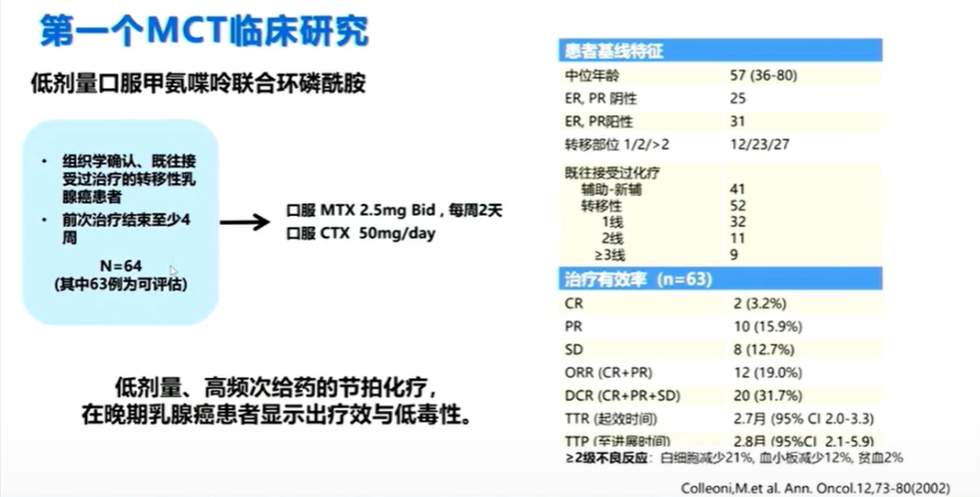 首项节拍化疗的临床试验为单臂临床研究,聚焦于晚期乳腺癌患者,该研究共入组了64名既往接受过多线治疗的晚期乳腺癌患者。在该项研究中,患者低剂量口服甲氨蝶呤联合环磷酰胺两种传统化疗药物进行治疗,其中环磷酰胺为50mg每天,甲氨蝶呤为2.5mg,bid,每周两天,两种药物剂量都远低于传统化疗。最终客观缓解率(ORR)为19%,疾病控制率达到31.7%。该项研究首次从临床试验水平证实高频次、低剂量的节拍化疗可以对晚期乳腺癌起到治疗效果且毒副反应较轻。