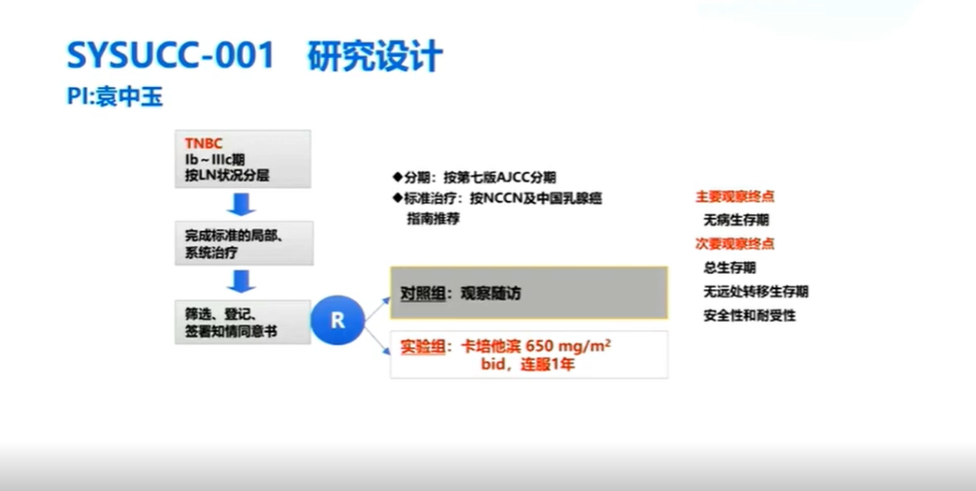受此项研究启发,袁中玉教授开展了SYSUCC-001研究,以探索卡培他滨节拍化疗用于早期三阴性乳腺癌的辅助强化效果。结果显示,在标准治疗结束后给予卡培他滨节拍化疗强化,患者的5年DFS率绝对提升10%。该项研究首次将节拍化疗用于早期乳腺癌维持治疗,并且取得了较好的结果;SYSUCC-001研究成功地验证了研究设计假设——节拍卡培他滨维持治疗可显著降低复发风险,特别是远处转移风险,引起了国内外学者的广泛关注。此外,中山大学肿瘤防治中心另一项聚焦HER2阳性早期乳腺癌患者的SMART试验也正在进行中。